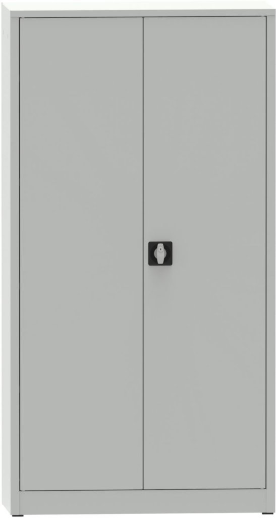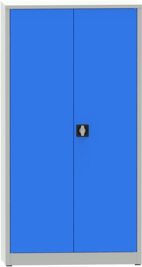 Two-door metal welded cabinet, width 950, height 1800, depth 400 mm, 4 adjustable shelves. Body color RAL 7035 light gray, doors RAL 7035 light gray and RAL 5012 blue.