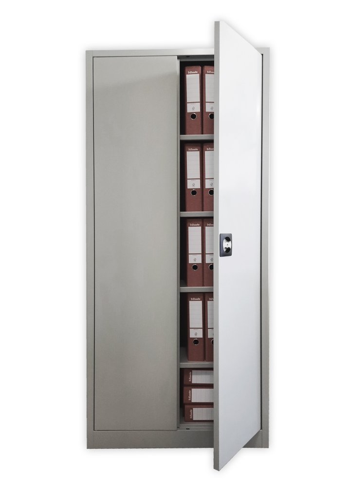 Two-door metal filing cabinet, 2x shelves, height 1000, width 800, depth 383 mm, lockable. Color gray RAL 7035.