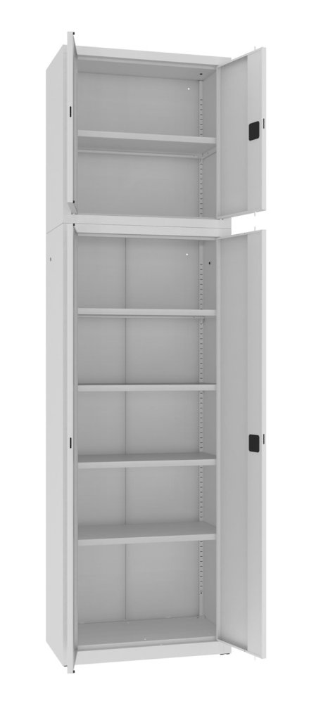 Two-door metal cabinet with four shelves, width 800 mm, height 1990, depth 435 mm supplemented with an extension with one shelf, width 800 mm, height 810, depth 435 mm. Two-point wheelbase lock, various colors.