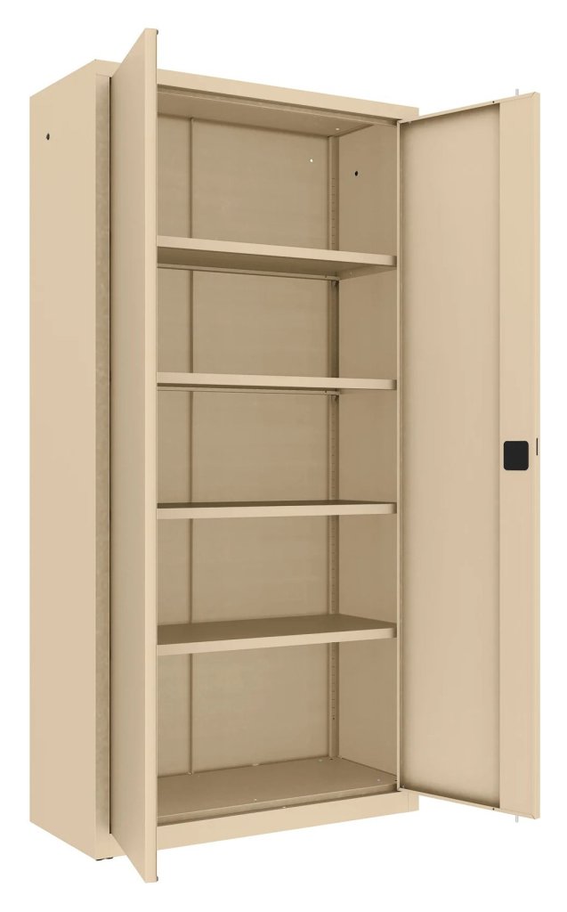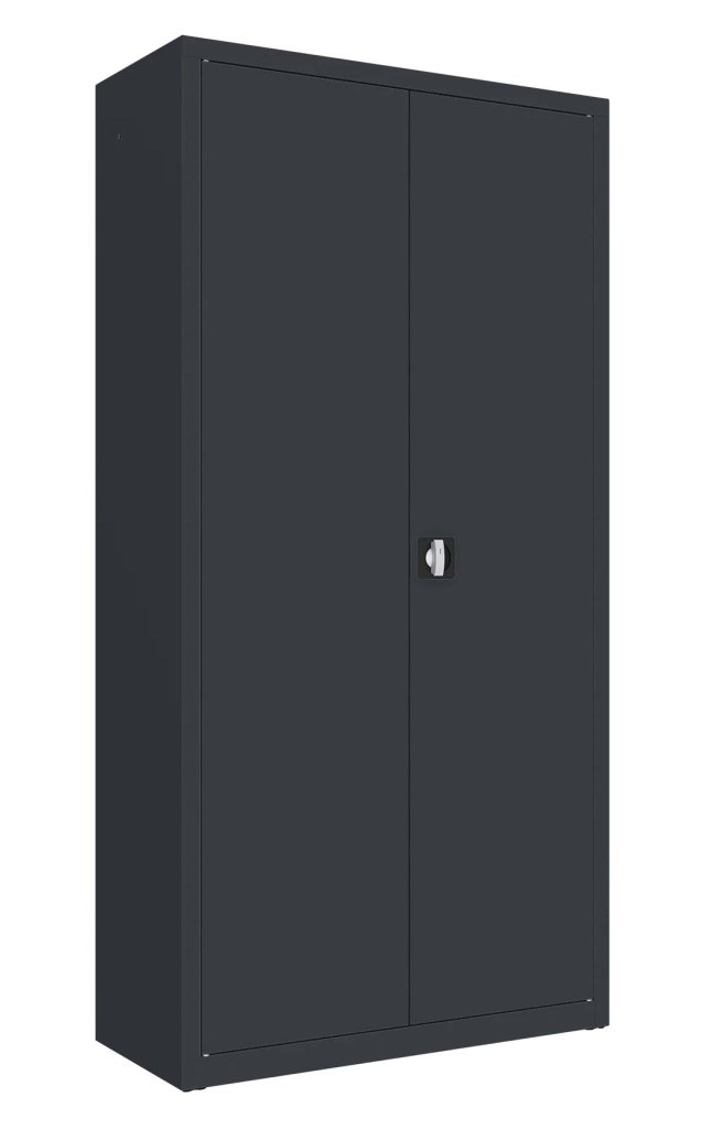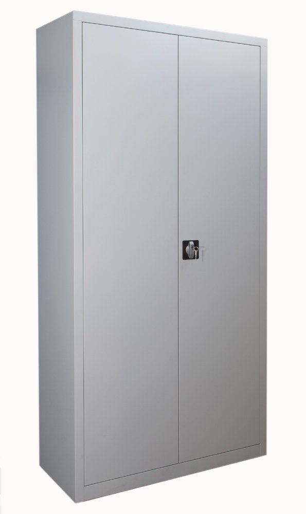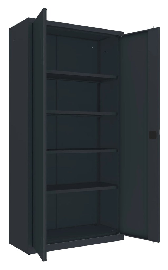 Two-door metal cabinet with four shelves, width 1000 mm (see product variants), height 1990, depth 435 mm. Two-point wheelbase lock, various colors.