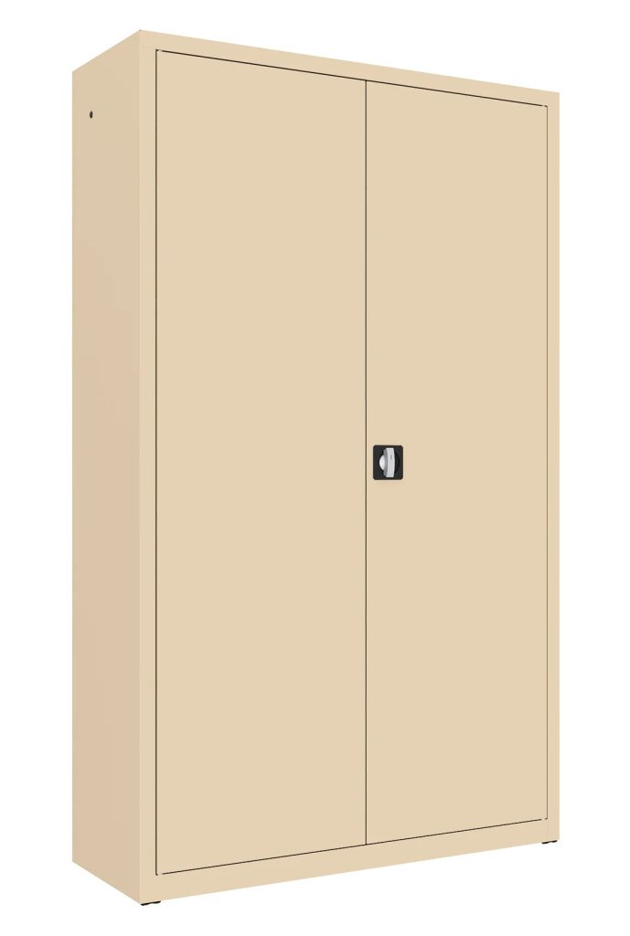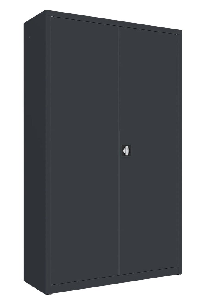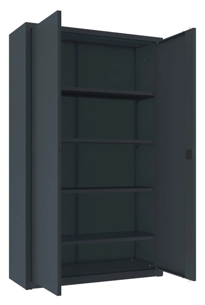 Two-door metal cabinet with four shelves, width 1200 mm (see product variants), height 1990, depth 435 mm. Two-point wheelbase lock, various colors.