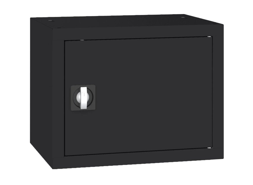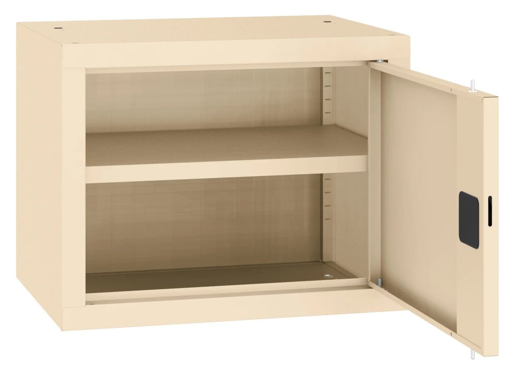 One-door metal cabinet with one shelf, suitable as an extension. Width 600 mm, height 810, depth 435 mm. Two-point wheelbase lock, various colors.