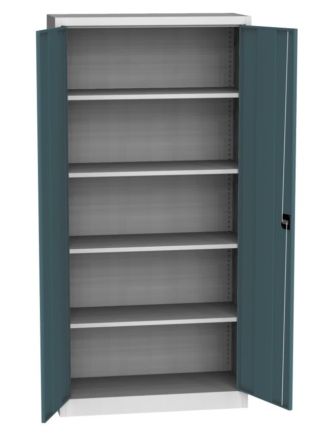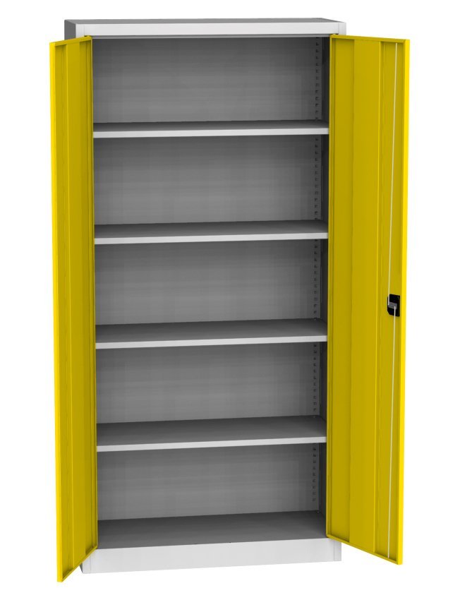 Cabinet with solid doors, height 1950 x width 505 x depth 400 mm. Locking on a cylinder lock with a wheelbase mechanism. 4 x adjustable steel shelves (load capacity 60 kg). The possibility of replacing solid doors with doors with glass filling, with wire filling or laminate doors in the shade of beech, birch or cherry. Body color RAL 7035 light gray.