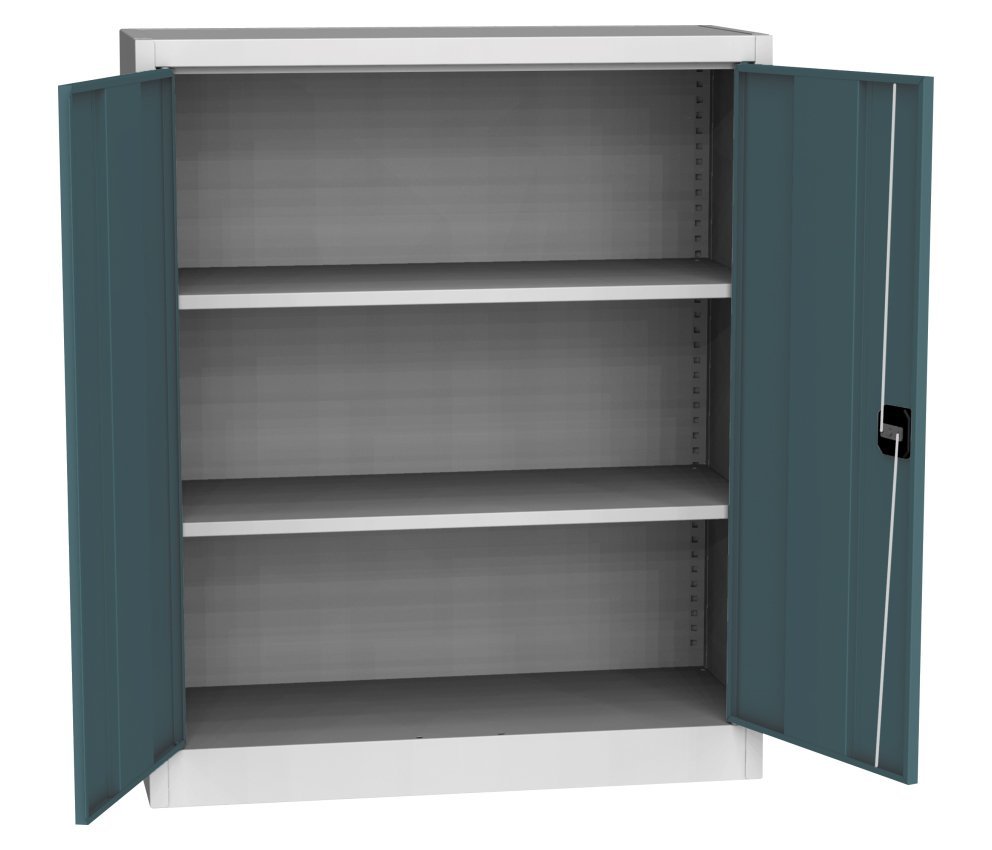 Two-door metal cabinet with plinth, width 950, height 1150, depth 400 mm, two shelves. The possibility of replacing solid doors full description and parameters
