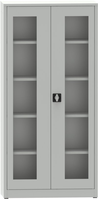 Two-door metal welded cabinet with Plexiglas glazed door, width 950, height 1950, depth 600 mm, 4 adjustable shelves. Body color full description and parameters