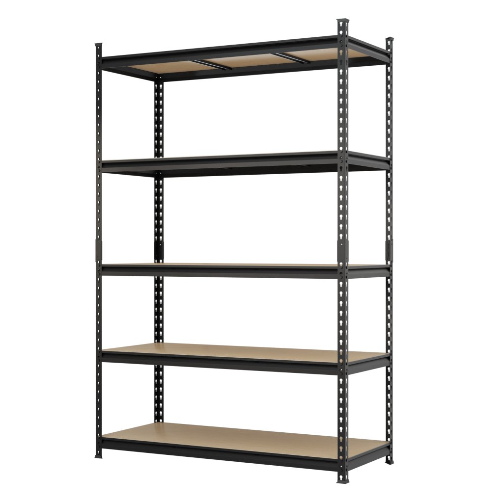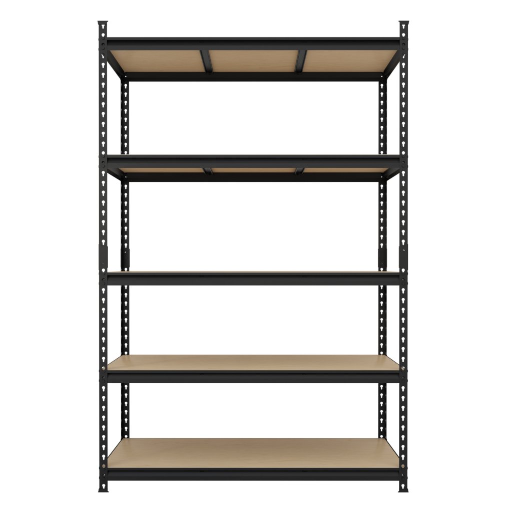 Universal metal screwless shelf suitable for workshops, warehouses, offices, garages or archives. Made of high-quality steel sheet, surface treated with black powder paint. 5x adjustable MDF shelves with reinforcement. Shelf load capacity 175 kg. Shelf dimensions (h x w x d) 1830 x 1200 x 500 mm. Supplied disassembled.
