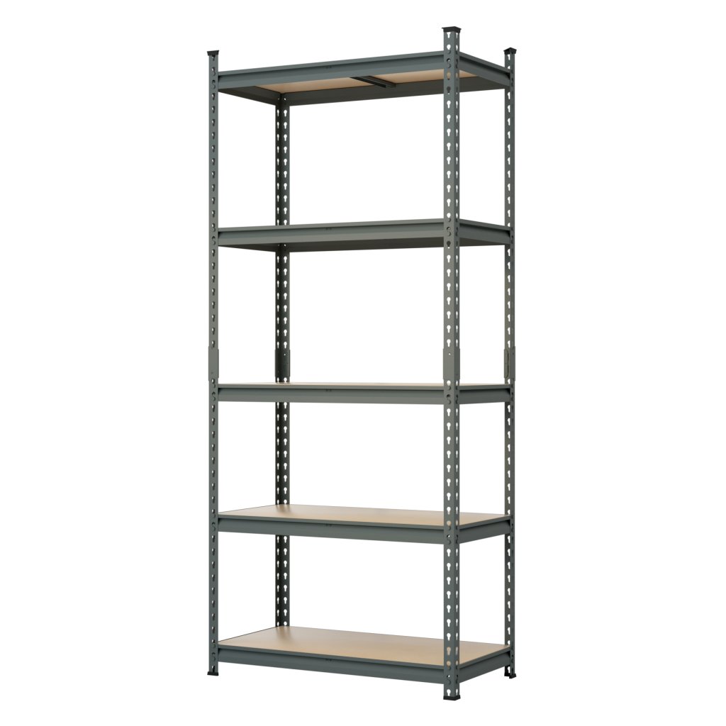 Universal metal screwless shelf suitable for workshops, warehouses, offices, garages or archives. Made of high-quality steel sheet, surface treated with gray powder paint. 5x adjustable MDF shelves with reinforcement. Shelf load capacity 175 kg. Shelf dimensions (h x w x d) 1830 x 800 x 600 mm. Supplied disassembled.