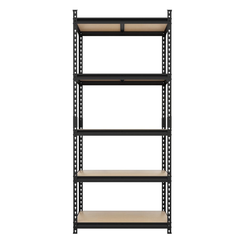 Universal metal screwless shelf suitable for workshops, warehouses, offices, garages or archives. Made of high-quality steel sheet, surface treated with black powder paint. 5x adjustable MDF shelves with reinforcement. Shelf load capacity 175 kg. Shelf dimensions (h x w x d) 1830 x 800 x 600 mm. Supplied disassembled.