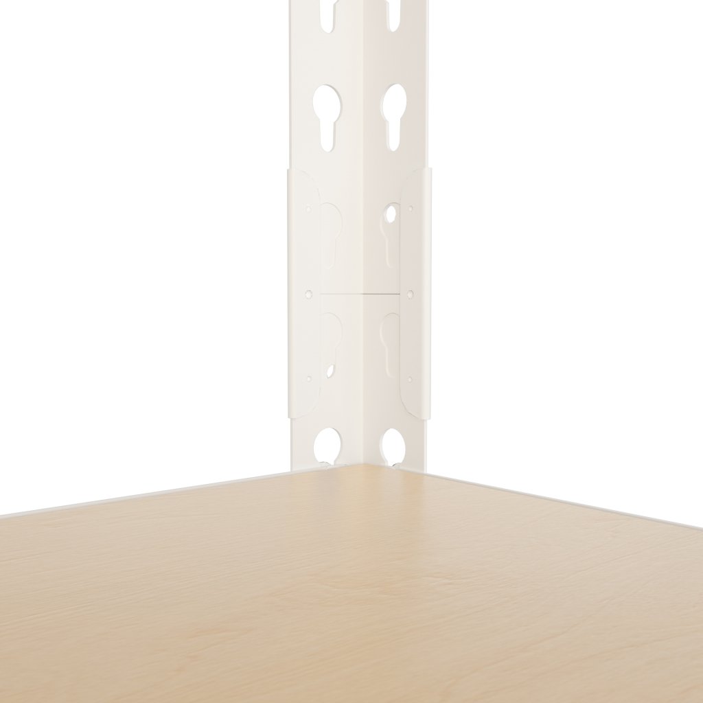 Universal metal screwless shelf suitable for workshops, warehouses, offices, garages or archives. Made of high-quality steel sheet, surface treated with white powder paint. 5x adjustable MDF shelves with reinforcement. Shelf load capacity 175 kg. Shelf dimensions (h x w x d) 1830 x 800 x 600 mm. Supplied disassembled.