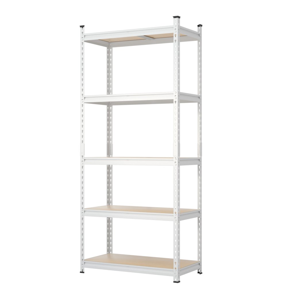 Universal metal screwless shelf suitable for workshops, warehouses, offices, garages or archives. Made of high-quality steel sheet, surface treated with white powder paint. 5x adjustable MDF shelves with reinforcement. Shelf load capacity 175 kg. Shelf dimensions (h x w x d) 1830 x 900 x 600 mm. Supplied disassembled.