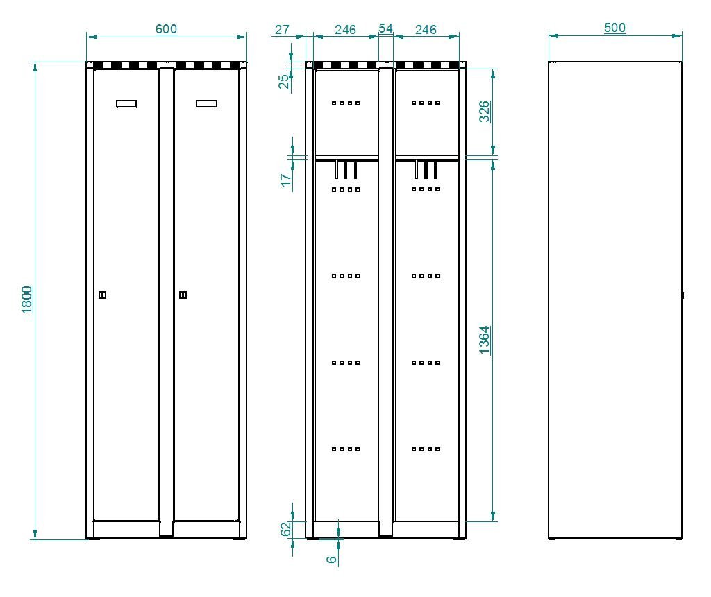 Double door wardrobe welded with double skin doors for greater security, height 1800 x width 600 x depth 500 mm. Locking with a cylinder lock or a padlock closure, interior equipment of each shelf compartment with a rod for hangers and a hook. On request with welded legs - cabinet height with legs 1950 mm. Body color RAL 7035 light gray.