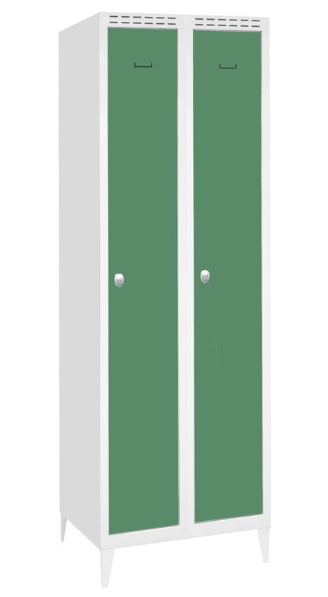 Double door wardrobe welded with double skin doors for greater security, height 1500 x width 800 x depth 500 mm. Locking with cylinder lock or padlock closure, interior equipment of each shelf compartment with rod for hangers and hook + vertical partition for separating clean and dirty clothes. On request with welded legs - cabinet height with legs 1650 mm. Body color RAL 7035 light gray.