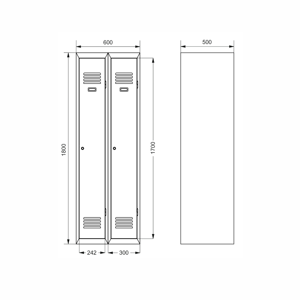 Two-door metal wardrobe on plinth, width 500, height 1850, depth 500 mm. Body color RAL 7035 light gray.