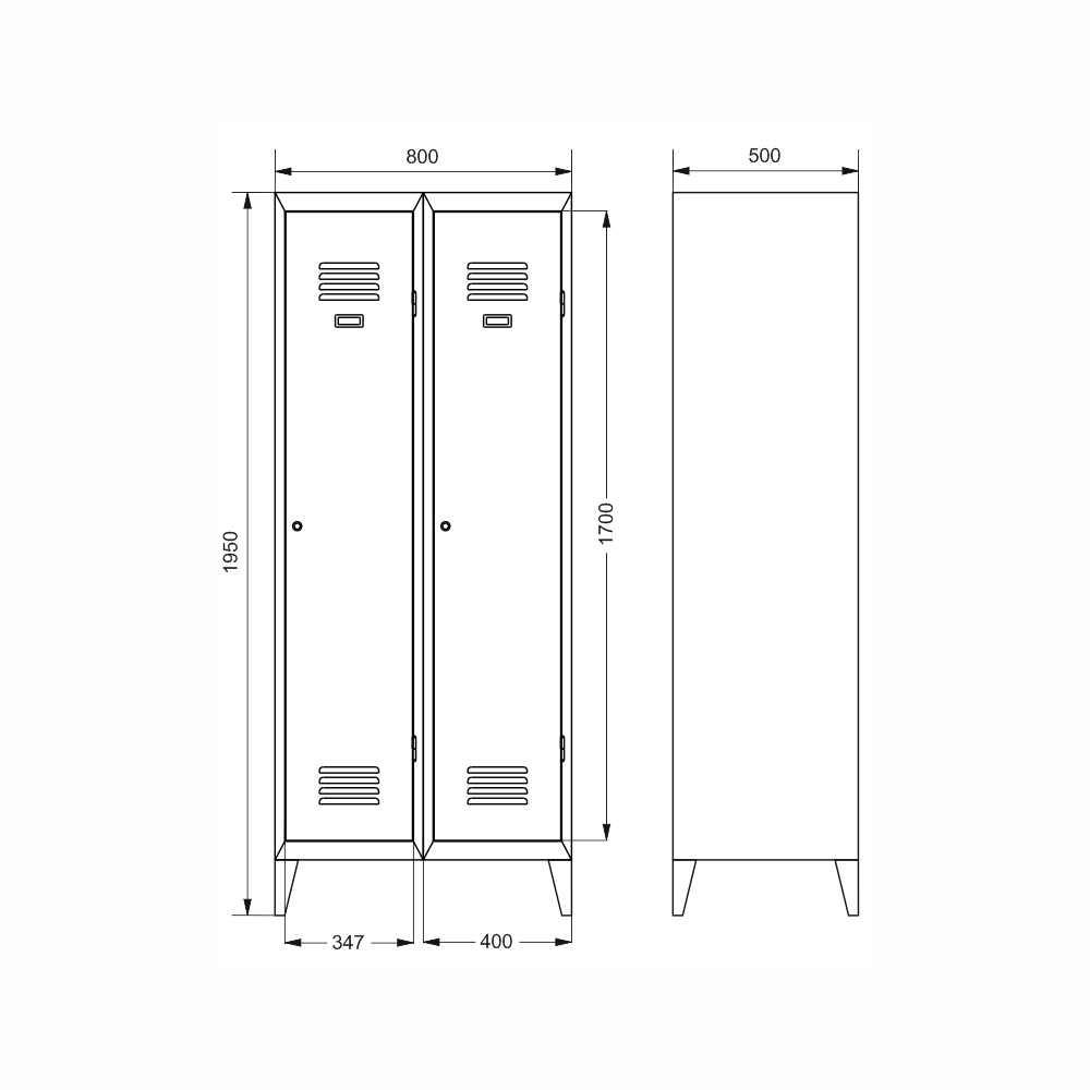Two-door metal wardrobe on legs, width 800, height 1950, depth 500 mm, lock or lock. Body color RAL 7035 light gray.