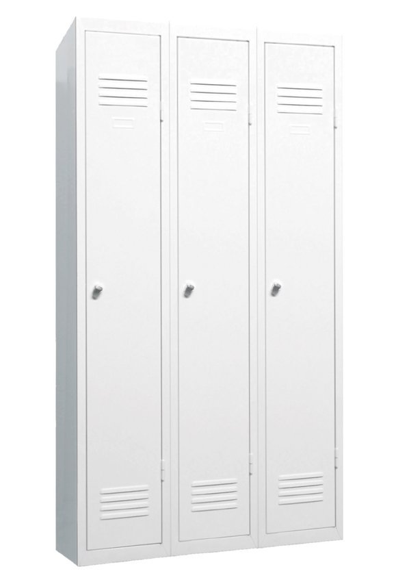 Three-door metal wardrobe on plinth width 1200, height 1800, depth 500 mm, cylinder lock or padlock closure. Vertical partition for separating clean and dirty clothes. Body color RAL 7035 light gray.