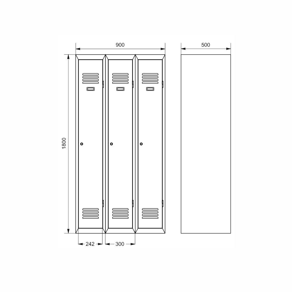Three-door metal wardrobe on plinth width 900, height 1800, depth 500 mm, cylinder lock or padlock closure. Body color RAL 7035 light gray.