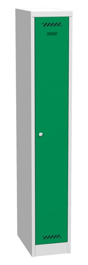 One-compartment welded wardrobe with compartment width 300 mm, height 1800 mm, depth 500 mm. Locking with a cylinder lock with two keys or a rotary lock for a padlock. Body color light gray, door color gray, blue, red, green or yellow. There is a bend in each compartment to prevent the door from being pushed into the cabinet and the lock from being pryed open.