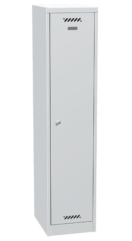 One-compartment welded wardrobe with compartment width 300 mm, height 1800 mm, depth 500 mm. Locking with a cylinder lock with two keys or a rotary lock for a padlock. Body color light gray, door color gray, blue, red, green or yellow. There is a bend in each compartment to prevent the door from being pushed into the cabinet and the lock from being pryed open.
