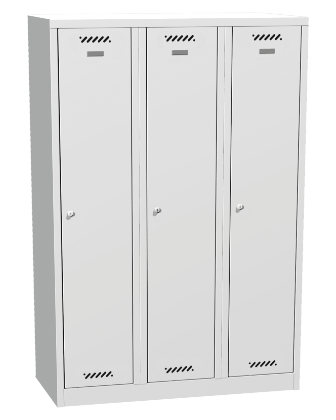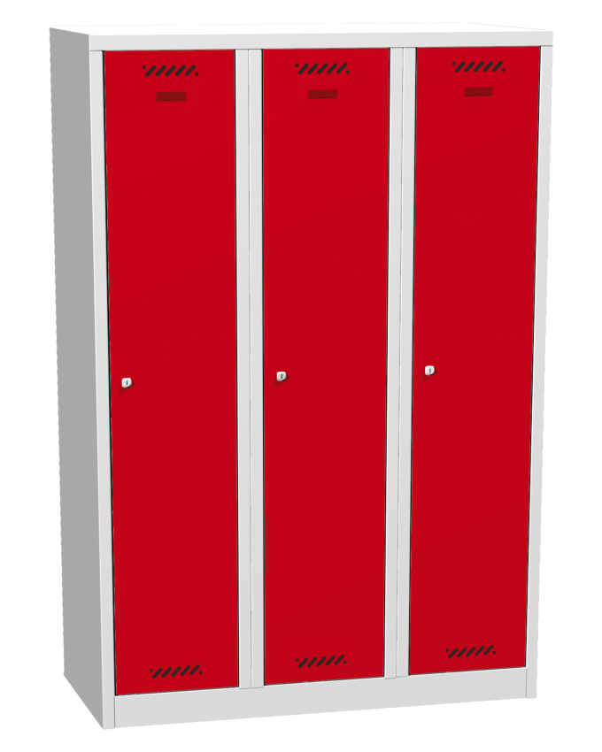 Three-compartment welded wardrobe width 900 mm with compartment width 300 mm, height 1800 mm, depth 500 mm. Locking with a cylinder lock with two keys or a rotary lock for a padlock. Body color light gray, door color gray, blue, red, green or yellow. There is a bend in each compartment to prevent the door from being pushed into the cabinet and the lock from being pryed open.