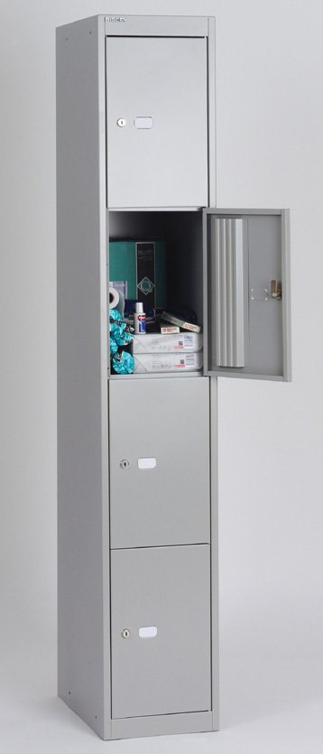 Four-door metal wardrobe width 305, height 1802, depth 305 mm. Locking with a cylinder lock with two keys with the option of replacing the lock with a padlock or code lock.