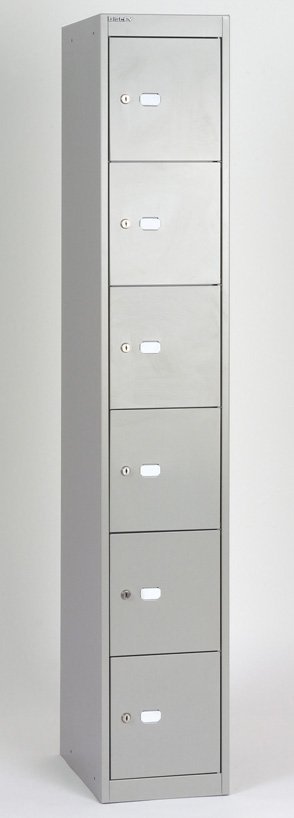 Six-door metal wardrobe width 305, height 1802, depth 305 mm. Locking with a cylinder lock with two keys with the option of replacing the lock with a padlock or code lock.