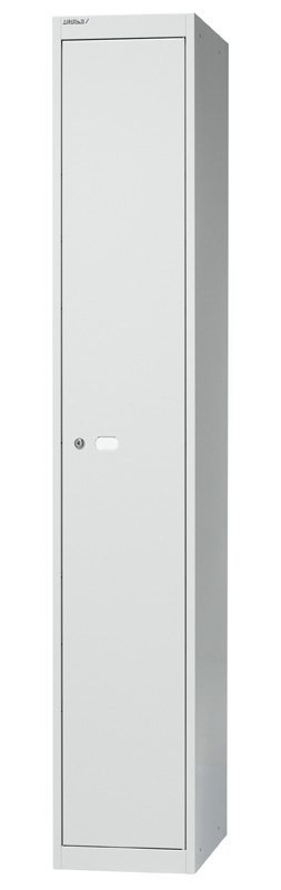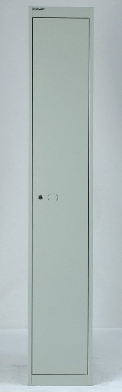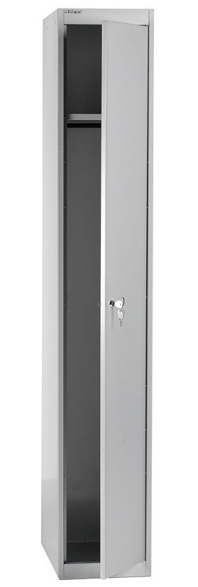 One-door metal wardrobe width 305, height 1802, depth 457 mm. Locking with a cylinder lock with two keys with the option of replacing the lock with a padlock or code lock.