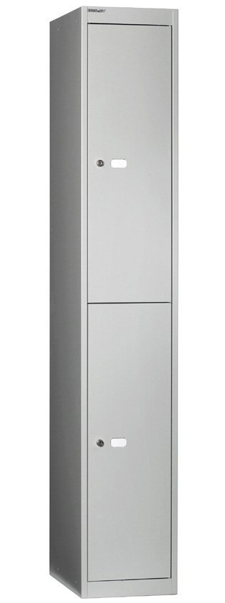 Two-door metal wardrobe width 305, height 1802, depth 305 mm. Locking with a cylinder lock with two keys with the option of replacing the lock with a padlock or code lock. There is one clothes hook in each department.