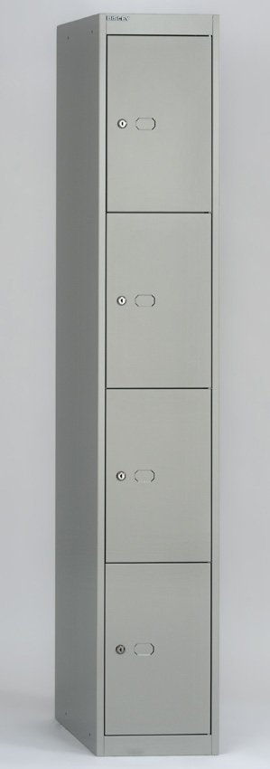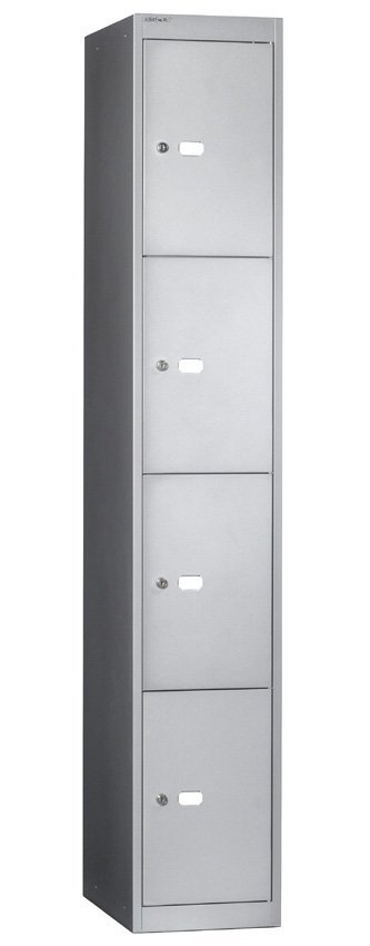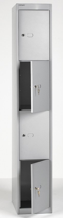 Four-door metal wardrobe width 305, height 1802, depth 305 mm. Locking with a cylinder lock with two keys with the option of replacing the lock with a padlock or code lock.