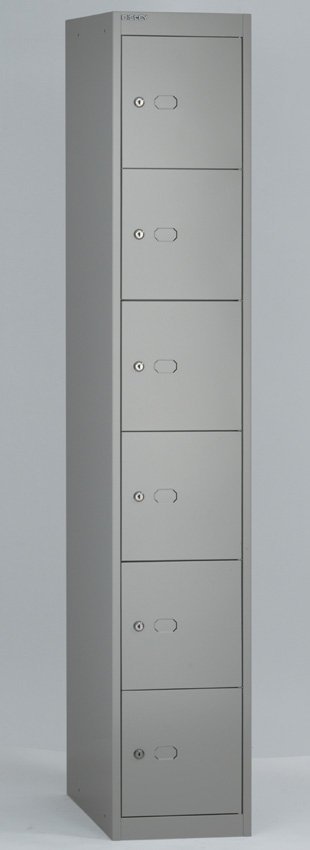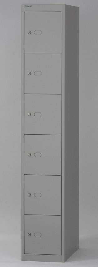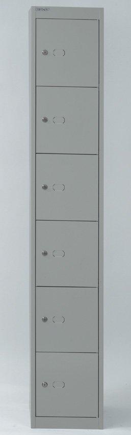 Six-door metal wardrobe width 305, height 1802, depth 305 mm. Locking with a cylinder lock with two keys with the option of replacing the lock with a padlock or code lock.