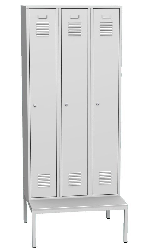 Three-door metal wardrobe with bench, width 900, height 2085, depth 810 mm. Body color RAL 7035 light gray.