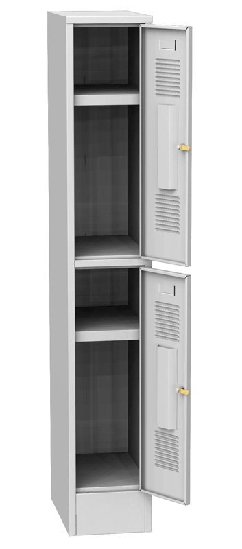 Two-door metal wardrobe divided 1/2 width 300, height 1850, depth 500 mm, at the top of each compartment there is a bar with three plastic sliding hooks. Body color RAL 7035 light gray.