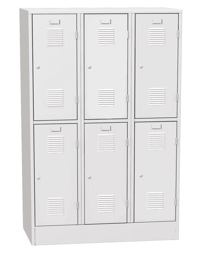 Six-door metal wardrobe divided 1/6 width 1200, height 1850, depth 500 mm, at the top of each compartment there is a shelf and a rod with three plastic sliding hooks. Body color RAL 7035 light gray.