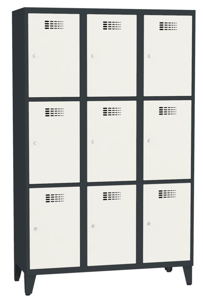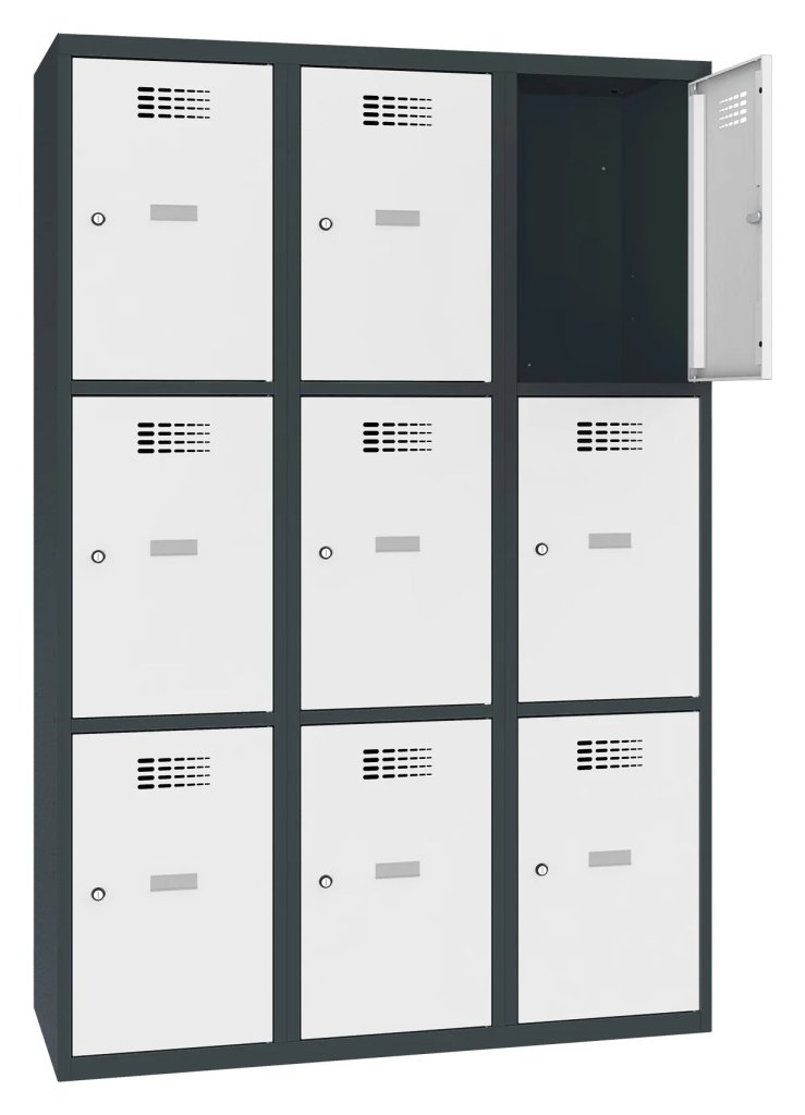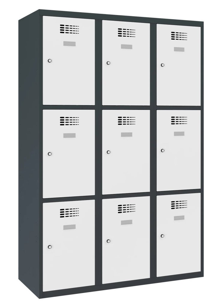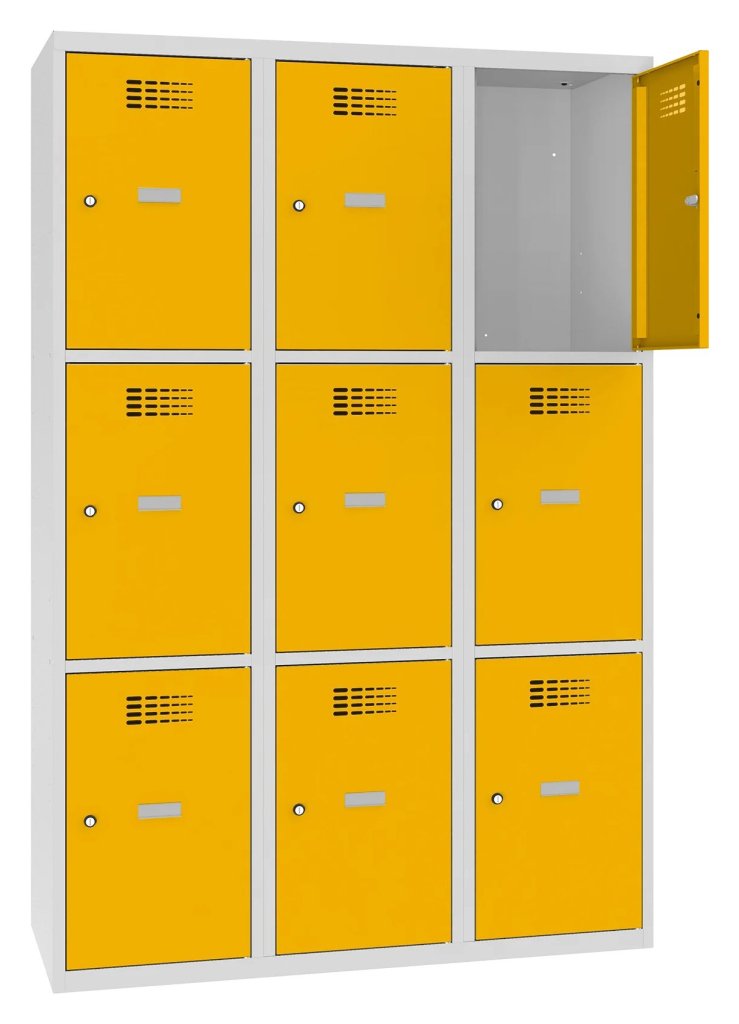 Nine-door wardrobe with welded construction and modern ventilation system design. Height 1800 x width 1200 x depth 500 mm. Self-adhesive name tag on the door. 16 color shades to choose from. Cylinder lock or padlock closure.