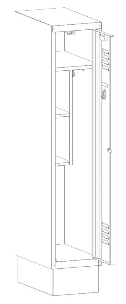 One-door metal wardrobe with a reduced height and a modern design of the ventilation system. Suitable for first graders. Height 1450 x width 300 x depth 500 mm. Self-adhesive name tag on the door. 16 color shades to choose from included in the price without extra charge. Different types of locking.