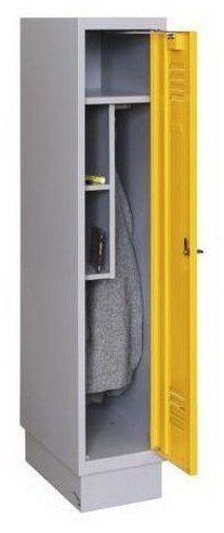 One-door metal wardrobe with a reduced height and a modern design of the ventilation system. Suitable for first graders. Height full description and parameters