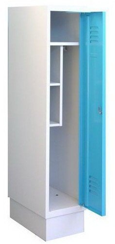 One-door metal wardrobe with a reduced height and a modern design of the ventilation system. Suitable for first graders. Height 1450 x width 400 x depth 500 mm. Self-adhesive name tag on the door. 16 color shades to choose from included in the price without extra charge. Different types of locking.