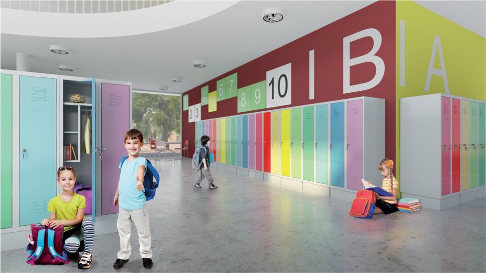 One-door metal wardrobe with a reduced height and a modern design of the ventilation system. Suitable for first graders. Height 1450 x width 300 x depth 500 mm. Self-adhesive name tag on the door. 16 color shades to choose from included in the price without extra charge. Different types of locking.
