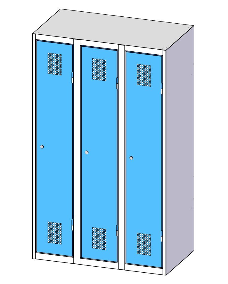 Three-door metal wardrobe width 750 mm, height 1500 mm, depth 500 mm, at the top of each compartment there is a rod with three plastic hooks, at the bottom of the shelf. Price without label for name tag.