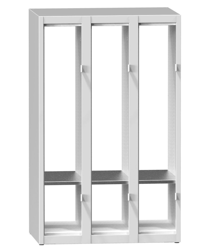 Three-door metal wardrobe width 750 or 900 mm, height 1200 mm, depth 500 mm, at the top of each compartment there is a rod with three plastic hooks, at the bottom of the shelf. Price without label for name tag.
