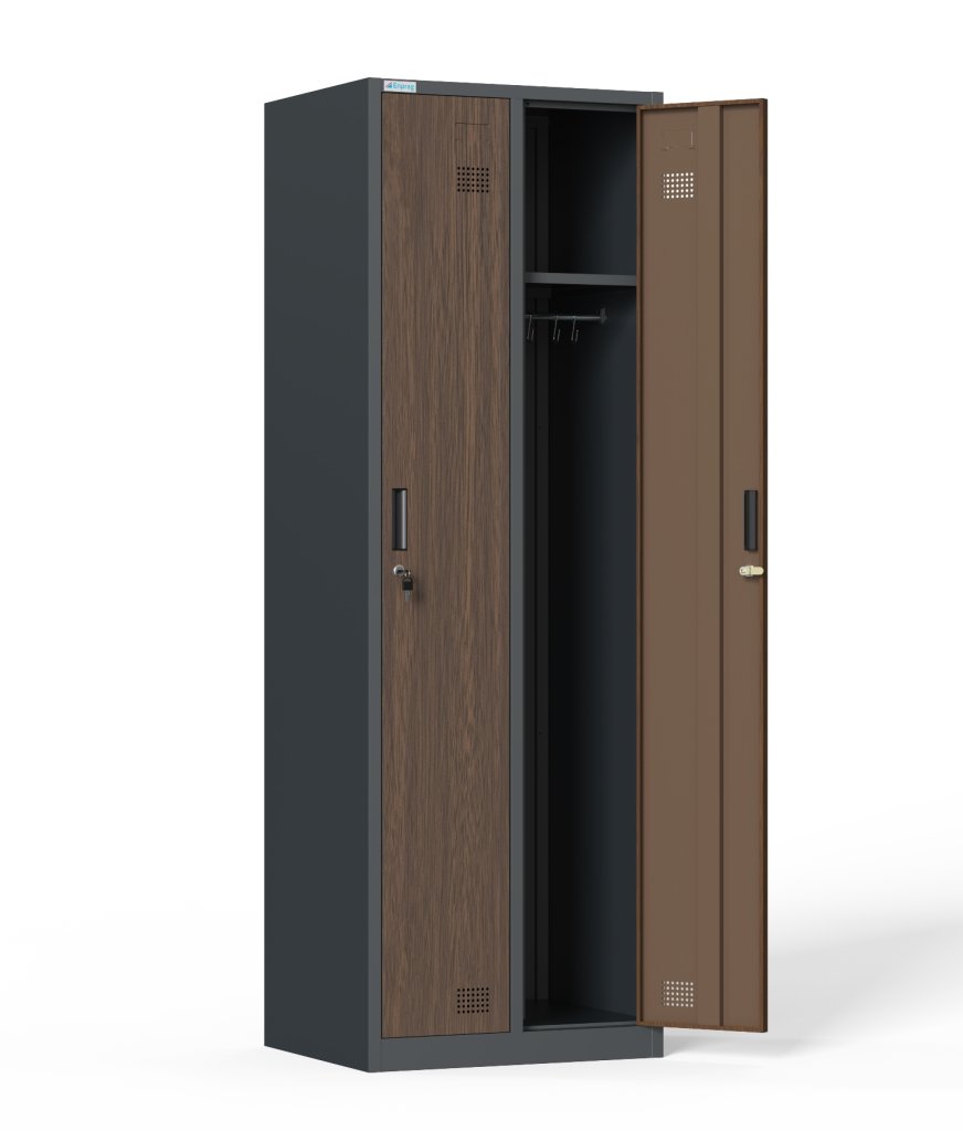 Wardrobe dismantled cabinet, height 1800 x width 600 x depth 500 mm. Locking with a cylinder lock with two keys. Surface treatment with powder paint anthracite RAL 7016/dark wood imitation.
