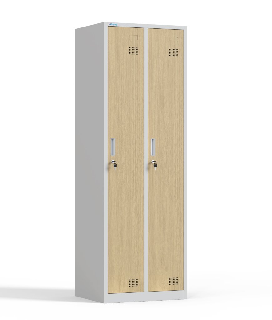 Two-part welded wardrobe height 1800 x width 600 x depth 493 mm. Locking with a cylinder lock with two keys or a rotary lock for a padlock. Body color light gray, HPL laminate door in blue, light green or light orange pattern. There is a bend in each compartment to prevent the door from being pushed into the cabinet and the lock from being pryed open.