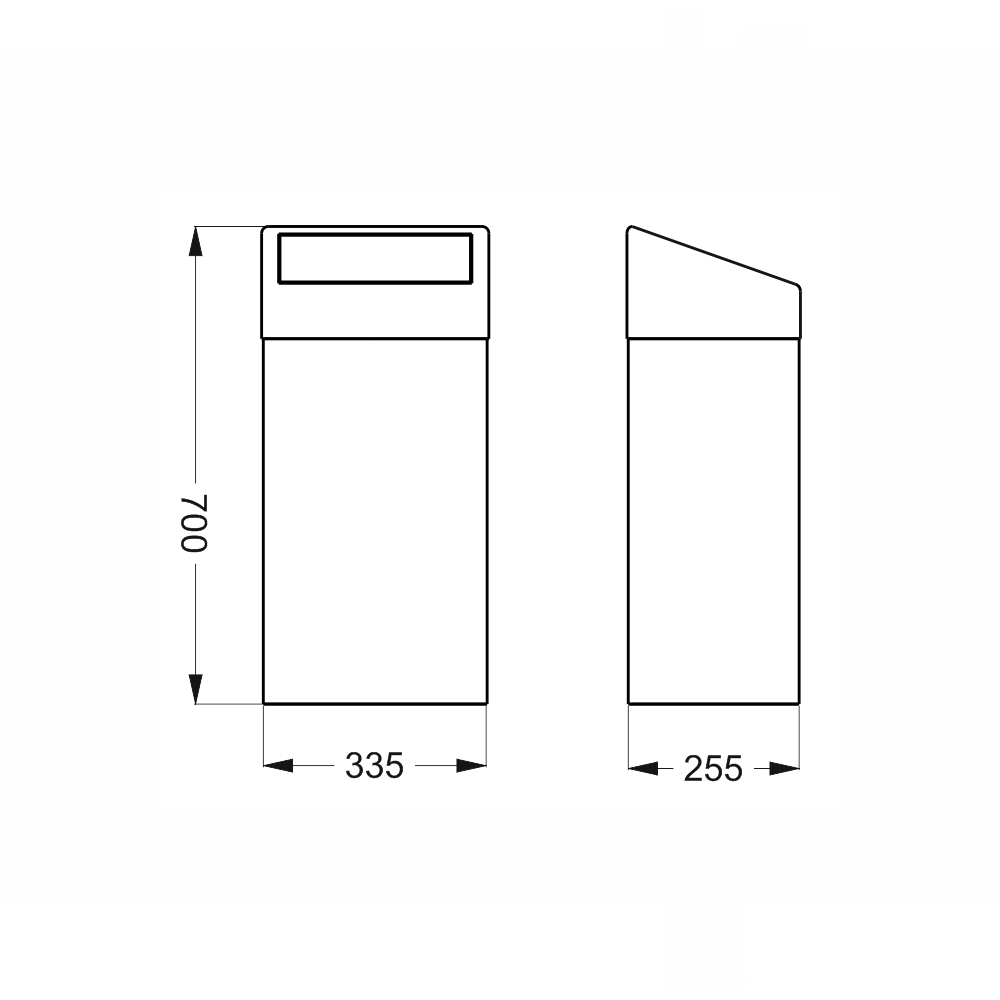 Metal container for sorted waste in different colors. Height 700 x width 335 x depth 255 mm. Self-closing drop-in flap, removable lid. For PE bags with a content of 50 l.