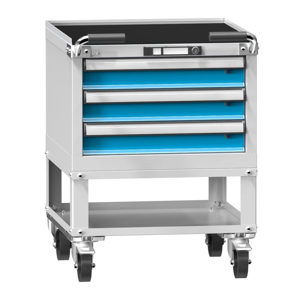 Mobile container, height 738, width 578, depth 600 mm. 3x drawer, 2x 100 mm fixed polypropylene wheels, 2x 100 mm swivel polypropylene wheels with brake, raised edge 20 mm + rubber mat, fixed handles. 3 x 100E socket. Internal dimensions of the drawer 459 x 459 mm.
