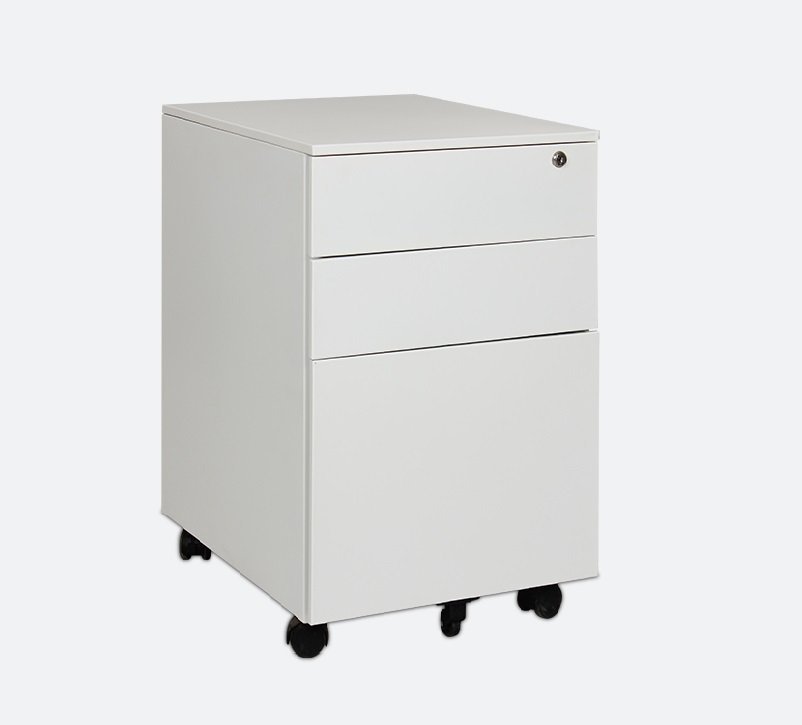 Mobile three-drawer container made of sheet steel with a thickness of 0.6 mm. Height 595 x width 390 x depth 500 mm, mass: 18 kg, central lock. Surface treatment with white powder paint.