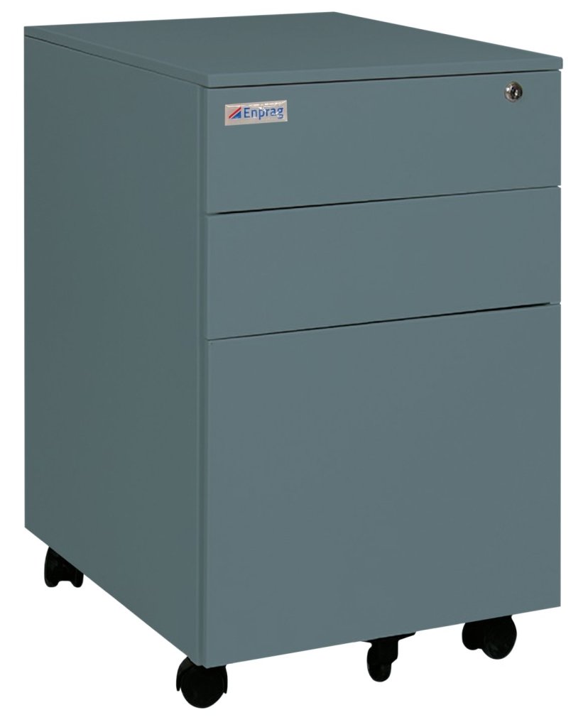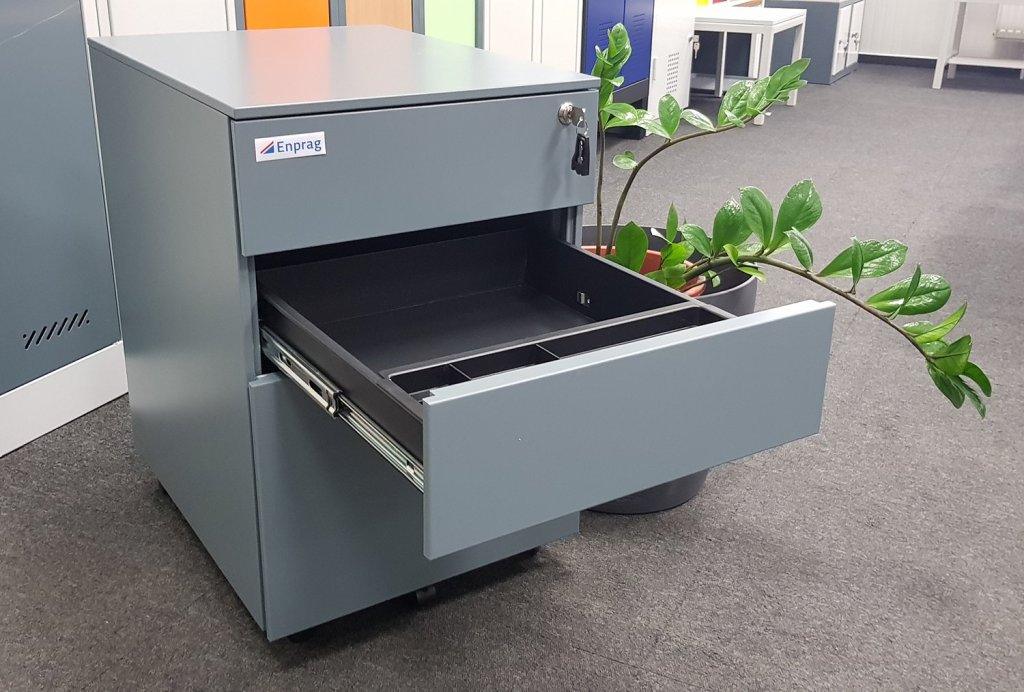 Mobile three-drawer container made of sheet steel with a thickness of 0.6 mm. Height 595 x width 390 x depth 500 mm, mass: 18 kg, central lock. Surface treatment with powder paint, color RAL 7031 dark gray.