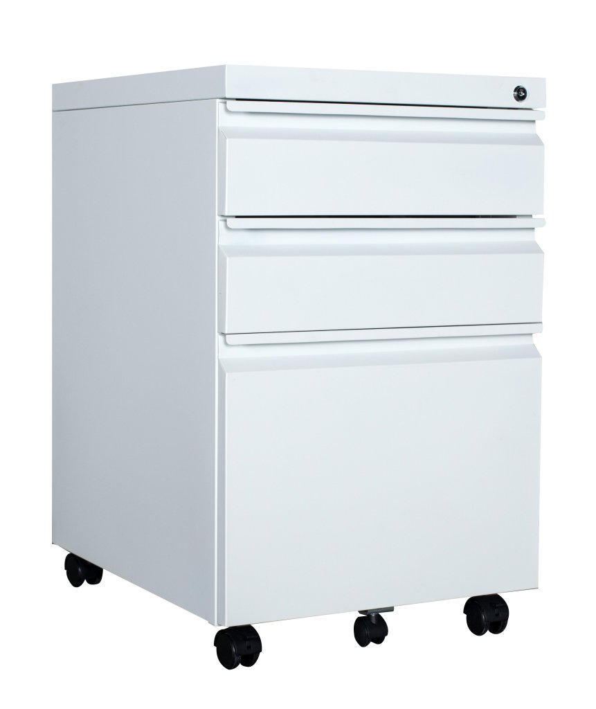 Mobile three-drawer container made of sheet steel with a thickness of 0.6 mm. Height 595 x width 390 x depth 500 mm, central lock. Surface treatment with white powder paint.
