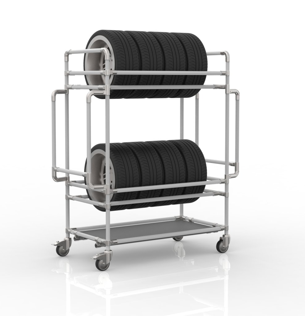 Mobile tire rack made from a tubular modular system with one shelf and two tiers. Ideal for tires measuring 16" to 20". The rack full description and parameters