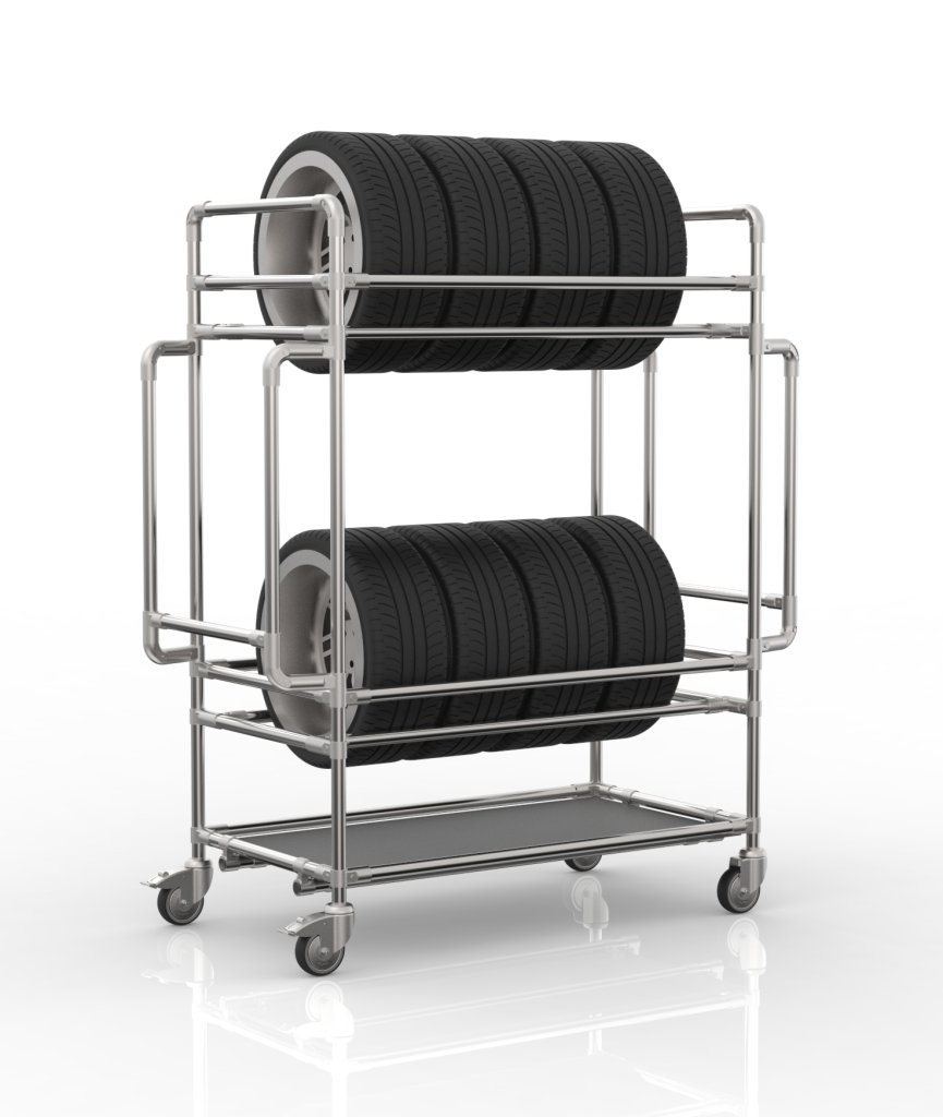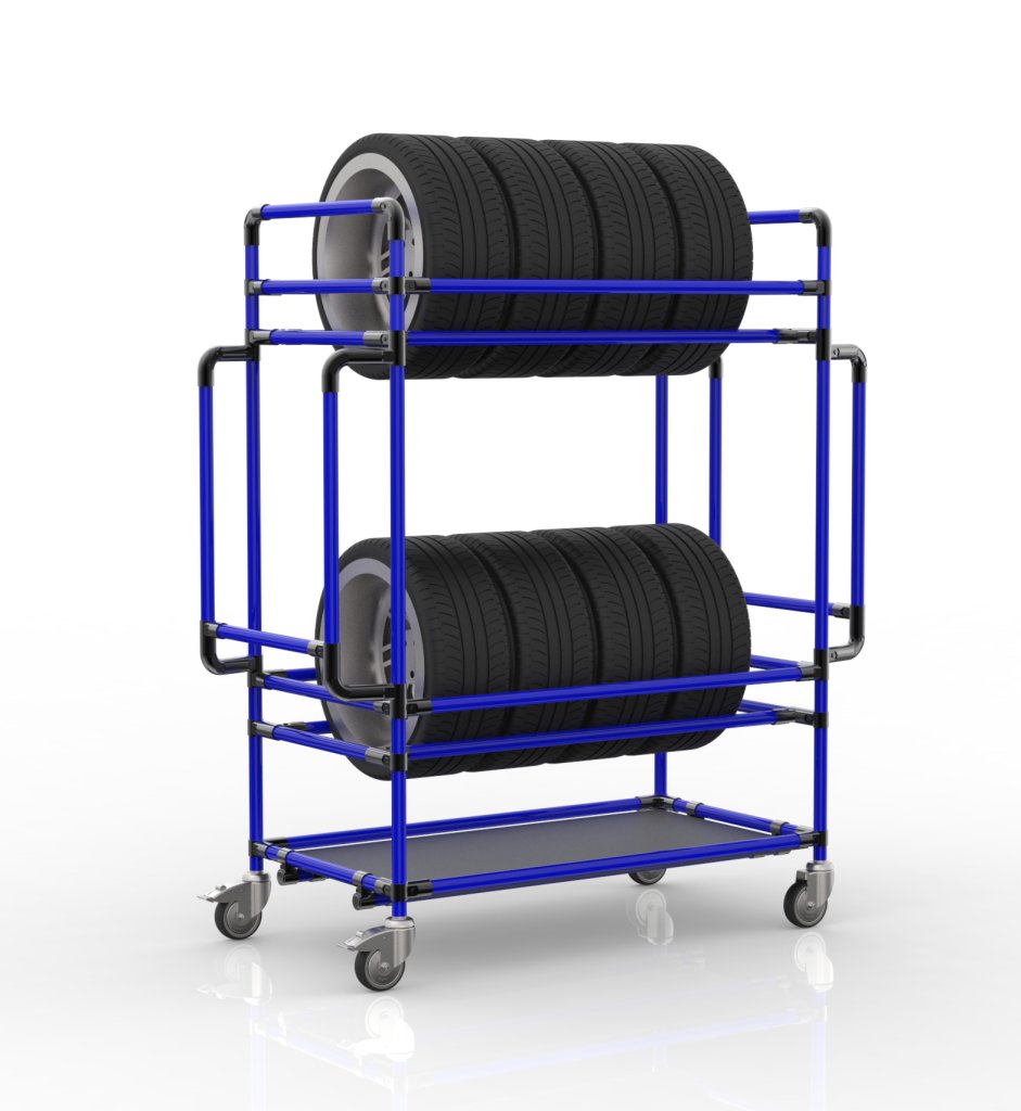 Mobile tire rack made from a tubular modular system with one shelf and two tiers. Ideal for tires measuring 16" to 20". The rack full description and parameters