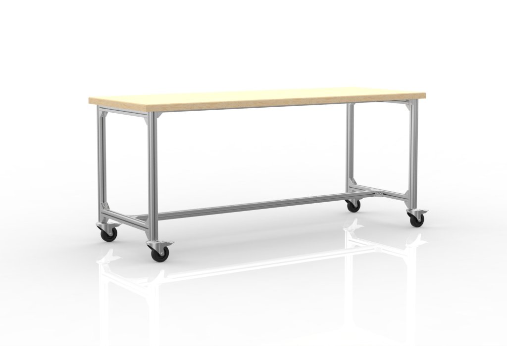 A mobile work table made of aluminum profiles that, thanks to its castors, allows easy handling and quick repositioning of the workspace.