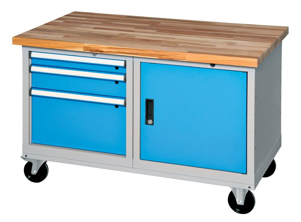 Mobile work table, worktop 1200 x 700 x 40 mm, table height 810 mm. Worktop joint beech 40 mm thick or beech multiplex (designation M - layered beech veneer) - thickness 40 mm. Table load capacity 340 kg.
